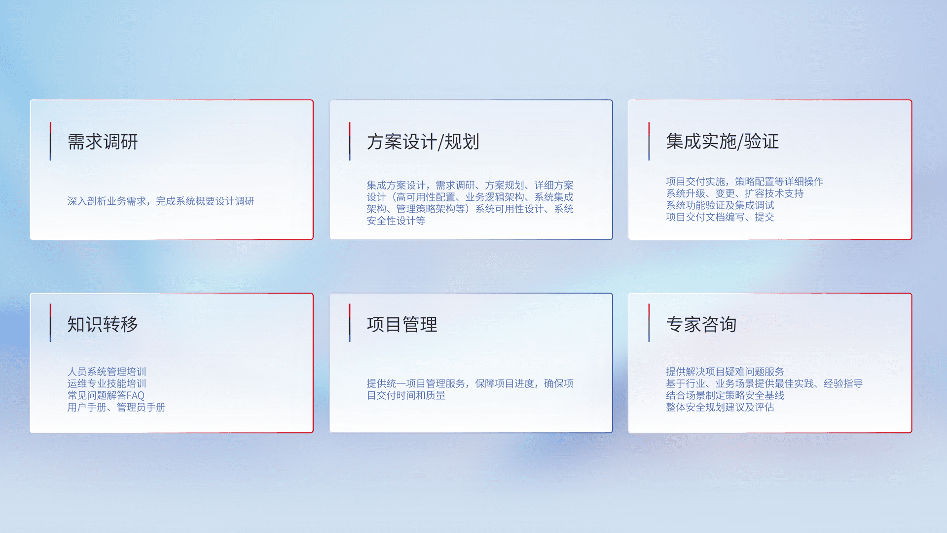 针对客户行业特性,,将宏观的安全战略和需求,,,,通过专业的交付服务,,实现项目落地,,,为客户提供标准规范的集成交付服务。。。。